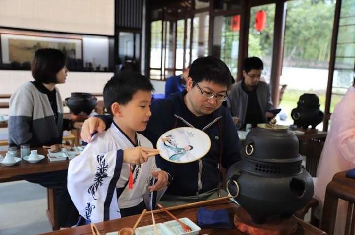 有兴趣的,还可以到陆羽泉公园,体验《茶经》中所记载的唐代陆羽煮茶法。跟从茶艺师的讲解,炙一块晕青携褐茶饼,碾末取粹,陈盐增味,佳水三沸……这一刻,大人和孩子身着古装,犹如穿越回唐朝。